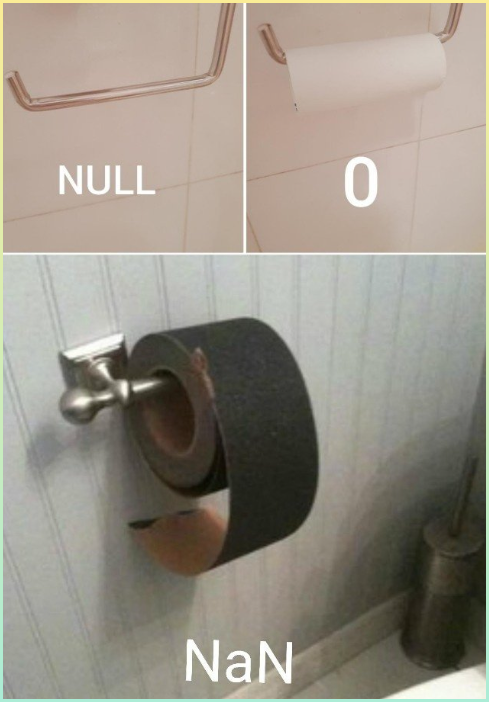 NULL은 휴지가 없는 것, 0은 휴지가 (다 써서) 없는 것, NaN(엑셀)은 휴지 걸이에 휴지가 아닌 것이 걸려 있는 것.